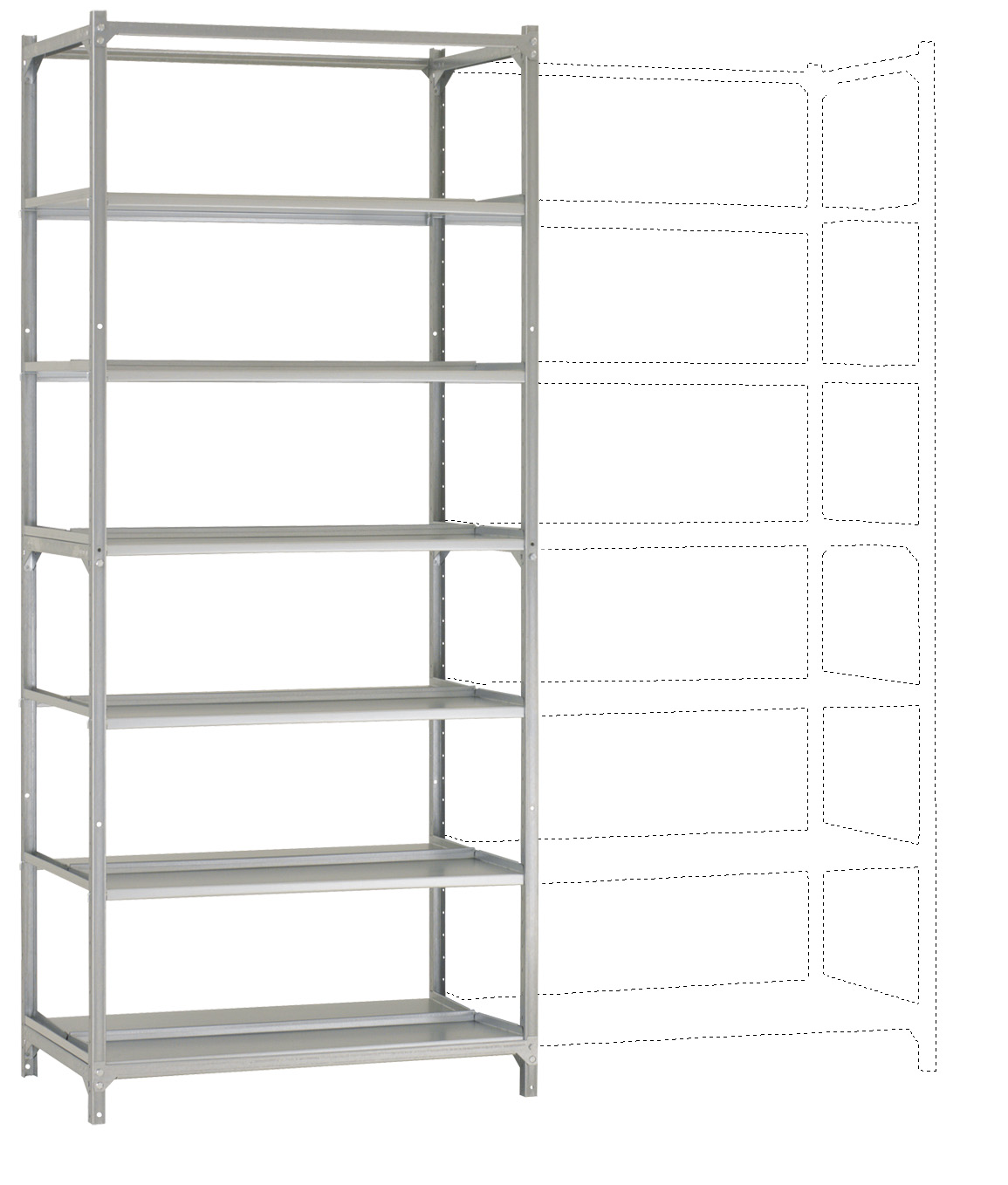 - Höhenverstellbarkeit der Fachböden im Raster von 50 mm (im Bereich der Längsverbindung 100 mm)
